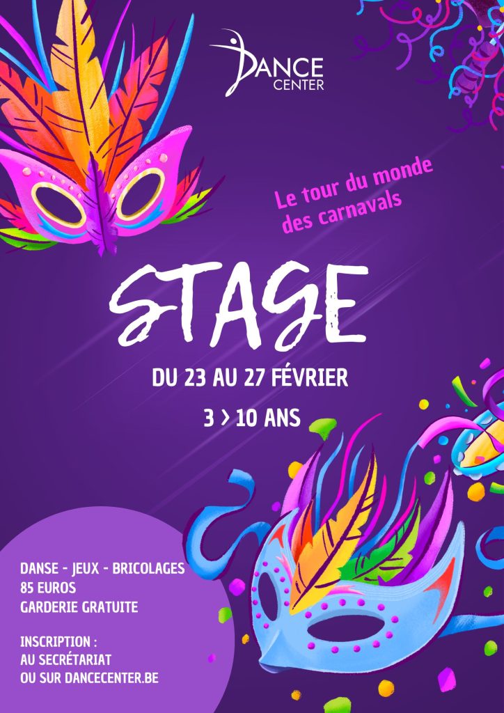 STAGES Stage de détenteLe tour du monde des carnavalsdu 23/02 au 27/02De 3 à 10 ans (répartis en plusieurs groupes)Danse, activités artistiques, jeux collectifs…Tarif: 85 eurosGarderie gratuite le matin et en fin de stageSieste possible pour les plus petitsINFOS: info@dancecenter.beINSCRIPTIONS: complétez ce formulaire et envoyez-le nous par mail accompagné de la preuve de paiement OU déposez-le au secrétariat de l’école pendant les heures de cours.Formulaire inscription stage détente 2026